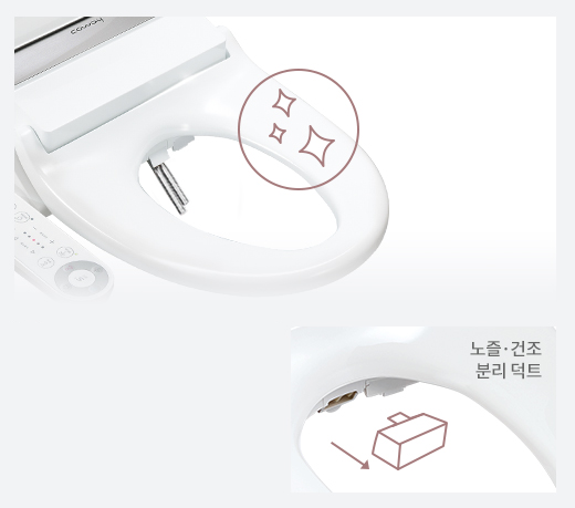 스테인리스 트윈 노즐과 오염이 쉽게 되지 않는 변좌로 더욱 깨끗한 비데를 사용할 수 있습니다.